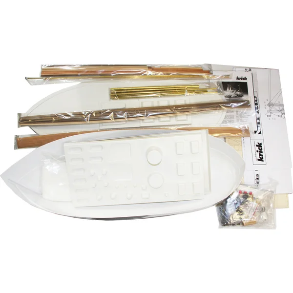 L’emballage contient un ensemble de pièces en plastique moulées par injection pour la coque, le pont et les superstructures, un ensemble de pièces en contreplaqué, des sachets avec de petites pièces, des pièces en laiton, une hélice de bateau avec un arbre, un ensemble de dessins et un manuel multilingue.