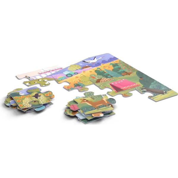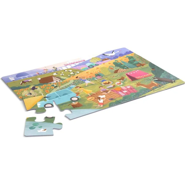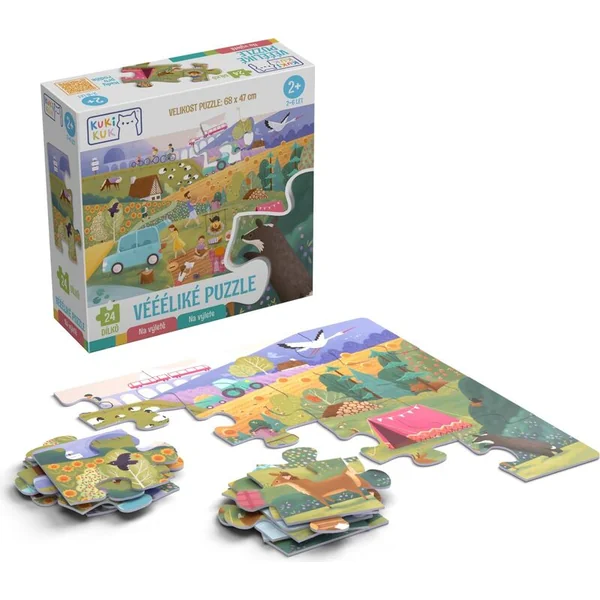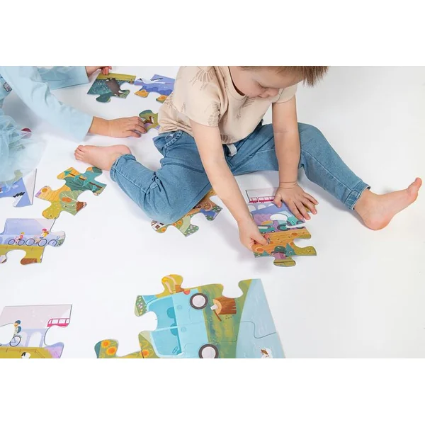 Les joyeux grands puzzles en excursion sont destinés aux petits agités ! Vingt-quatre pièces extra grandes, dont l’assemblage forme une image pleine d’histoires de 675×470 mm, représente un grand défi. Le puzzle est conçu de manière à ce que la ligne des pièces connectrices ait une forme qui ne permet d’assembler que les bonnes images qui vont ensemble. Les pièces sont extrêmement grandes pour que les petites mains d’enfants puissent bien les saisir. Parlez aux enfants des différentes scènes de l’image et laissez-les découvrir de nouvelles choses. En bonus, le dos des puzzles propose des coloriages d’animaux à compléter ou à tracer. Idéal pour le développement de la motricité fine, du vocabulaire et d’autres compétences nécessaires aux jeunes enfants. Fabriqué en carton solide de 2 mm d’épaisseur.