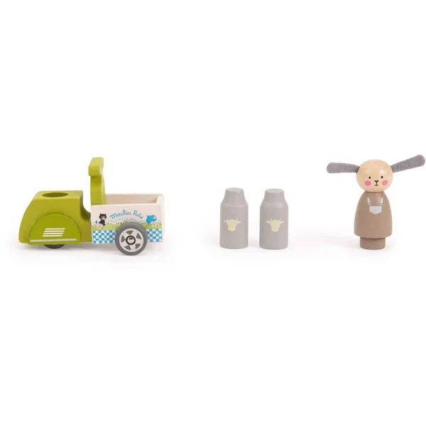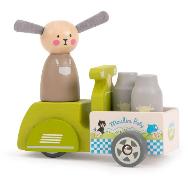 A l’aide de son triporteur, Albert le mouton va livrer son lait fraîchement recueilli à toute la Grande Famille. Tout en bois, l’ensemble comprend Albert et son triporteur chargé de 2 pots de lait.