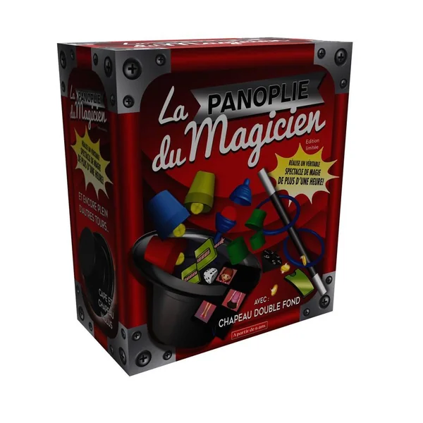 Réalise un extraordinaire spectacle de magie et deviens un véritable magicien devant toute ta famille et tes amis. Ce coffret comprend un chapeau double fond ainsi que tout le matériel nécessaire pour réaliser un spectacle de plus d’une heure. Accessoires inclus : baguette magique, chapeau double fond, anneaux magiques, corde reconstituée, podium magique, coquetier magique, toupie, fille coupe en trois, gobelets magiques et pièce à faire disparaître. Notice pour les tours incluse. Dimensions du coffret : 13 x 25 x 29 cm. Baguette magique : indispensable à tous les petits magiciens ! Chapeau double fond : grâce à sa trappe secrète, ce véritable chapeau de magicien va te permettre de réaliser de nombreux tours extraordinaires. Anneaux magiques : deux anneaux sont totalement prisonniers dans deux cordons. Tu vas réussir à les libérer en un éclair d’un coup de baguette magique. Corde reconstituée : une corde tout à fait ordinaire va être coupée en deux à l’intérieur d’un boitier très spécial. En repositionnant les deux compartiments du boîtier ensemble, la corde va miraculeusement se reconstituer et va même être donnée à examiner pour constater qu’il n’y a aucune trace de coupure ni de déchirure. Podium magique : voici un accessoire qui va te permettre de faire plein de choses extraordinaires. Tu vas pouvoir par exemple transformer une pièce de monnaie en morceau de papier ou bien encore transformer une pièce de 10 cts en pièces de 20 cts. Coquetier magique : la boule à l’intérieur du coquetier a des pouvoirs surnaturels. Elle peut, par exemple, voyager en un éclair de ta poche jusqu’à l’intérieur du coquetier. Suprême coïncidence : Voilà une toupie absolument extraordinaire. Une fois lancée, elle s’arrête à chaque fois sur le chiffre choisi au hasard par ton spectateur. Fille coupée en trois : Tu vas pouvoir couper en trois morceaux bien distincts une superbe jeune fille avant de la reconstituer sans qu’il ne figure aucune trace de coupure ni de déchirure. Gobelets magiques : tu vas pouvoir faire passer trois petites boules aux pouvoirs surnaturels à travers des gobelets posés sur une table ! Un effet très visuel et qui est d’autant plus incroyable que les gobelets ne sont pas truqués. Disparition d’une pièce : grâce à un superbe fourreau complètement truqué, une pièce de monnaie va disparaître sous les yeux des spectateurs ébahis et réapparaître dès que le magicien le souhaitera grâce à une simple petite passe magique.