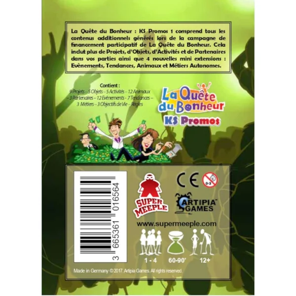 La Quête du Bonheur : KS Promos 1 et 2 comprennent tous les contenus additionnels générés lors de la campagne de financement participatif de La Quête du Bonheur. Pour le KS2, cela inclut plus de Projets, d’Objets, d’Activités, de Partenaires, d’Objectifs de Vie et de Talents Nés dans vos parties ainsi que 3 nouvelles mini extensions : Amis, Animaux et Métiers Autonomes.