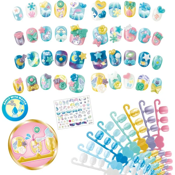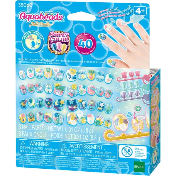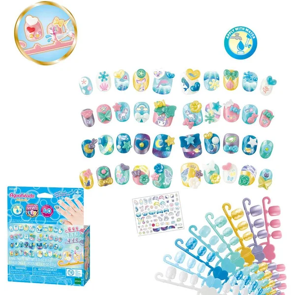 Cette recharge contient des ongles et décorations supplémentaires à utiliser en complément des coffrets pour prolonger l’activité créative. Choisis les ongles adaptés à ta taille. Décore les avec des autocollants. Puis, pose dessus des petits accessoires selon ton envie en les faisant adhérer avec de l’eau : ils colleront comme par magie ! Ensuite, pose un petit peu d’eau sur ton ongle, place l’ongle Aquabeads que tu as préparé, fais sécher 3 minutes : la magie opère de nouveau ! Change ta manucure à l’infini, selon tes envies, et en toute sécurité !