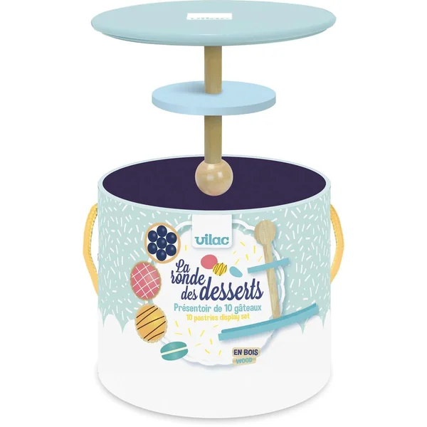 Un service de 10 gâteaux et patisseries en bois appétissants servis dans une jolie boite qui se transforme en service à gâteaux.