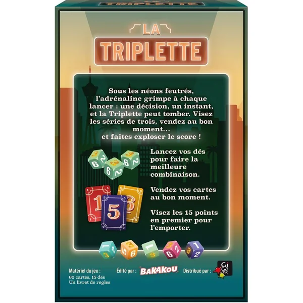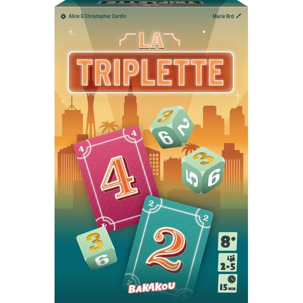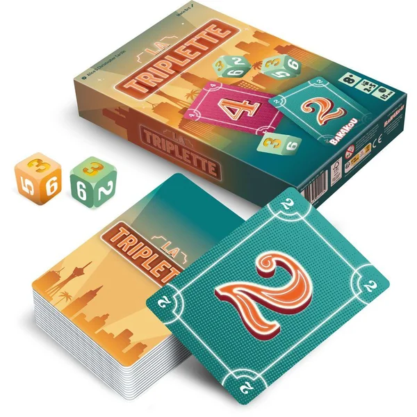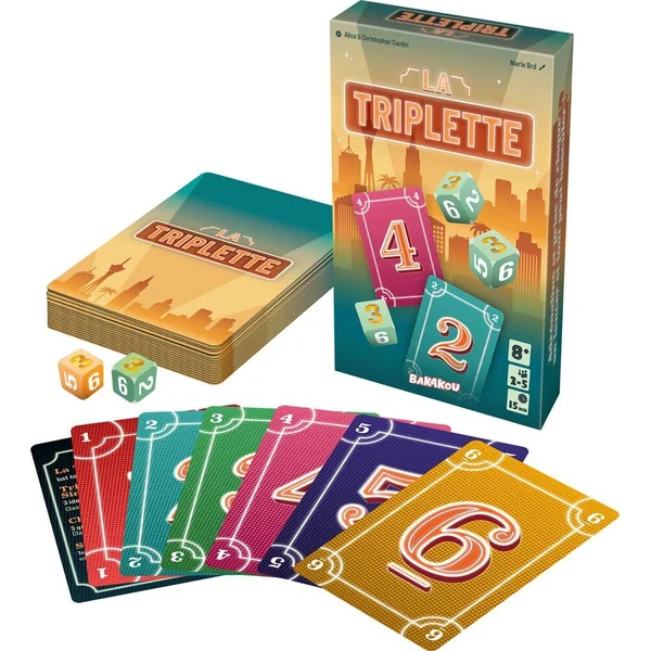 Sous les néons, La Triplette mêle adrénaline, prise de risque et timing chirurgical. À chaque tour, lancez 3 dés, on compare Triplette > Chainette > Simplette, puis, du plus fort au moins bon, chacun prend 1 carte dans la rivière. En fin de tour, vendez jusqu’à 2 séries de 3 cartes : pour un Trio, gardez 1 carte au score ; pour une Suite, gardez la carte du milieu. Vos points = la valeur de la carte gardée. Les deux autres partent à la défausse. Une carte ne sert qu’une fois le même tour. La partie est une course à 15 points : le premier qui y parvient l’emporte — et si égalité, on départage au nombre de cartes au score. Rapide à expliquer, tendu à jouer, La Triplette récompense l’audace autant que le sang-froid.