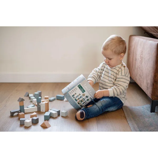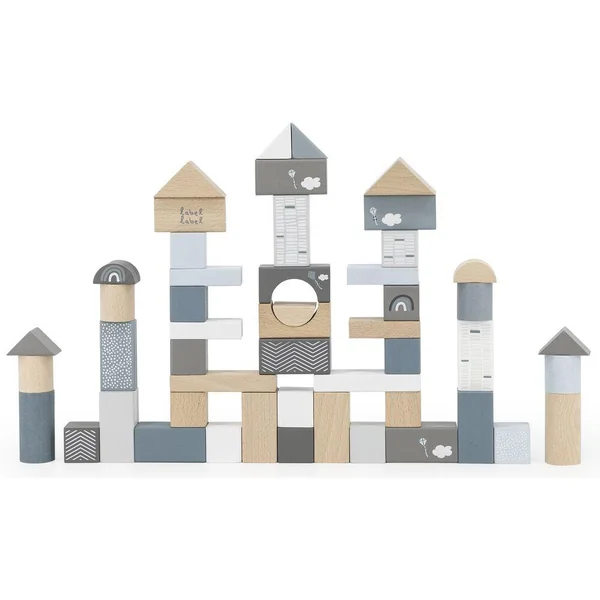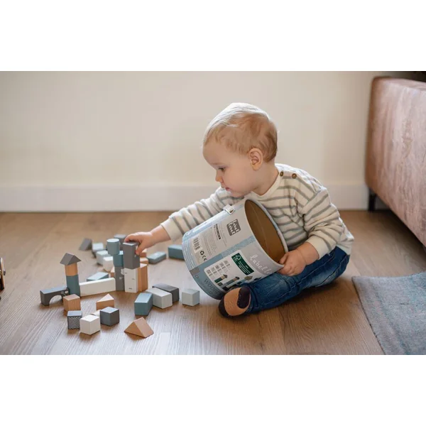 Ces blocs de bois sont faits de bois de hêtre certifié FSC de qualité. L’ensemble se compose d’une combinaison de cubes de bois naturels et de beaux cubes de couleur bleu/blanc/gris colorés à l’aide de peinture à base d’eau non nocive pour enfants.