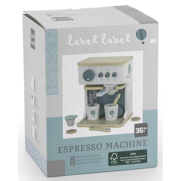 Asseyez-vous et dégustez un délicieux caffe americano préparé par votre mini-Barista avec cette belle machine à espresso dans le style maison Label Label. Elle est faite de bois certifié FSC de qualité et a été décorée avec des couleurs et des symboles à l’aide de peinture à base d’eau non nocive pour enfants.