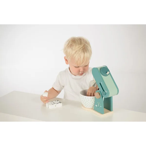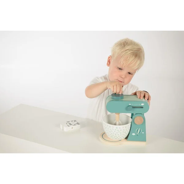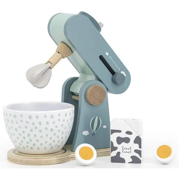 Ce robot de cuisine Label Label est exactement ce dont les petits chefs ont besoin pour donner vie à leurs créations imaginaires. Le mélangeur est soulevé de sorte que tous les ingrédients peuvent être mis dans le bol à mélanger. Descendez le mixeur et mélangez! En tournant le levier, le fouet mélangera tous les ingrédients. Le curseur peut être utilisé pour régler la vitesse de mélange. Le plaisir de cuisson est assuré! L’ensemble est complété par les accessoires: un œuf à ouvrir et bien sûr une briquette de lait à ajouter à la pâte.