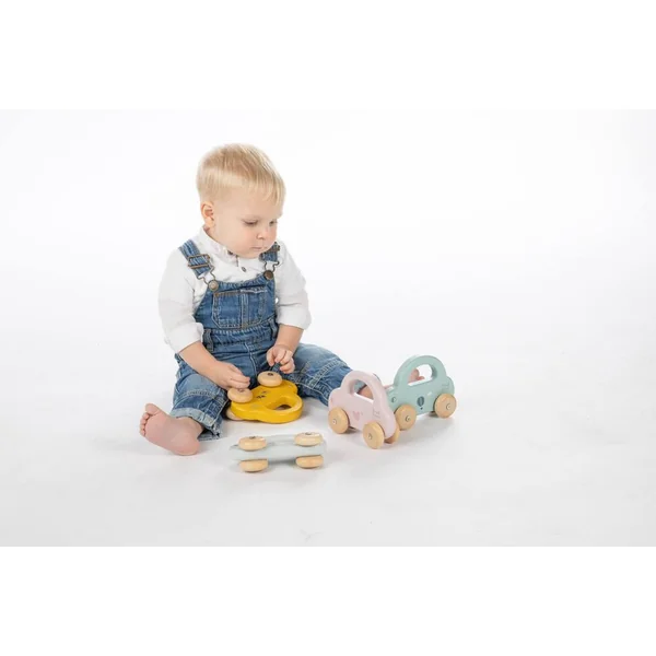 Les tout-petits prennent facilement la voiture par la poignée pour conduire la voiture ou l’emmener où elle veut. La conception simplifiée de la voiture, les couleurs douces combinées avec des roues en bois naturel sont parfaits pour stimuler le développement motrice de votre tout-petit.