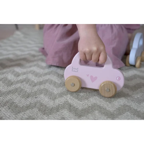 Cette voiture profilée est faite de bois de hêtre certifié FSC de qualité et a été décorée avec une belle couleur rose en utilisant de la peinture à base d’eau non nocive pour les enfants.