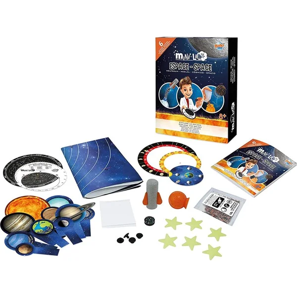 Vous y trouverez une carte du ciel étoilé, des étoiles qui brilleront ce soir au-dessus de votre tête, du matériel pour fabriquer un météore sautant, une affiche du système solaire de taille 58x43cm, une boussole, et aussi une fusée avec laquelle vous découvrirez les subtilités du troisième principe de la dynamique – le principe d’action et de réaction.