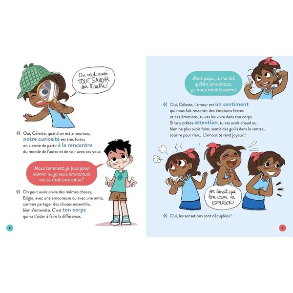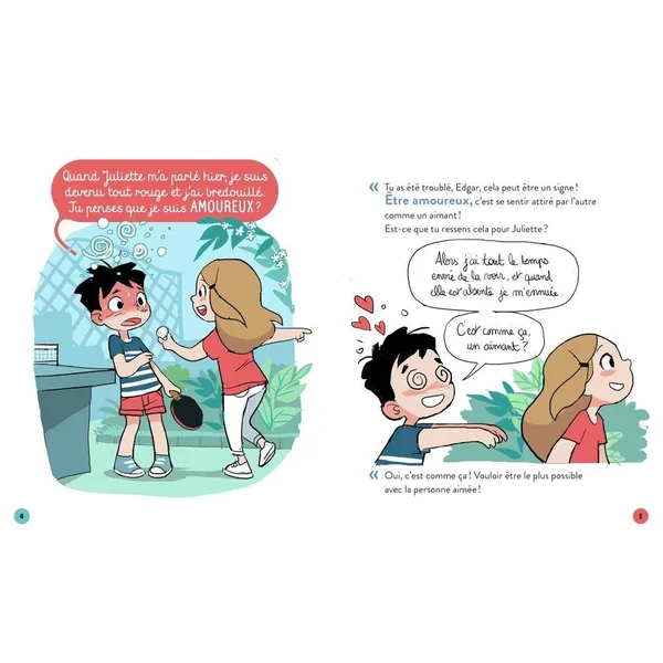 Dans un style parlé et immédiat, le narrateur échange avec les deux enfants et rebondit à leur interrogations en déroulant un fil qui les conduit à comprendre une situation ou un comportement d’amour o d’amitié, à l’accepter ou à le modifier.Le titre part d’une situation du quotidien de l’enfant, puis on déroule le propos en apportant des pistes de réponses et des propositions d’aides clefs, pour dédramatiser.L’originalité de la collection tient au jeu progressif des questions qui amène à la compréhension globale d’un problème. Le ton est léger, peu formel, spontané, et le discours est émaillé d’exemples du quotidien, de ceux que rencontrent réellement dans leur vie, les enfants.l’amour Pourquoi je rougis quand Juliette me parle ?thèmes abordés : être amoureux ça fait quoi, c’est comment ?L’amour pour ses parents, pas le même.L’amitié avec ses amis.l’amour de soi.aimer un garçon ou une fille.Ne plus aimer. ex de déroulé : Quand Juliette m’a parlé hier, je suis devenu tout rouge et j’ai bredouillé, tu penses que je suis amoureux? Oui cela peut être un signe, mais que ressens tu, Hedgar, pour Juliette? J’ai envie d’être avec elle et alors je me sens bien! Je crois qu’être amoureux ça rend content et ca nous fait des bonds dans le coeur! Alors je dois être amoureux, mais je vais jamais oser lui dire!! Mais pourquoi? J’ai trop peur, elle m’aime pas peut-être? C’est important de suivre l’élan de notre coeur et c’est normal d’avoir peur de le partager. C’est courageux d’y arriver! Et si elle m’aime pas? Je pense Hedgar que l’amour est une richesse et qu’il fait battre ton coeur et que tu peux continuer à aimer sans retour….. Et pourquoi quand j’aime ma maman ca me fait pas pareil ?…