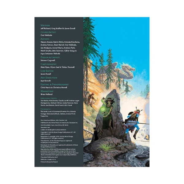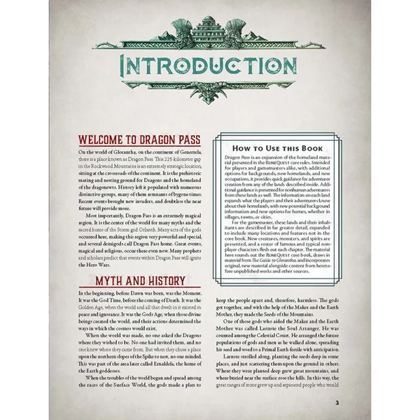 Lands of RuneQuest: Dragon Pass contient une histoire détaillée, depuis le légendaire Temps des Dieux jusqu’à l’occupation par le puissant Empire Lunaire. Vous y trouverez également des informations sur les villages, les villes, les cités, les ruines et les lieux d’intérêt à travers Dragon Pass – parfait pour mener une campagne de style sandbox dans RuneQuest.