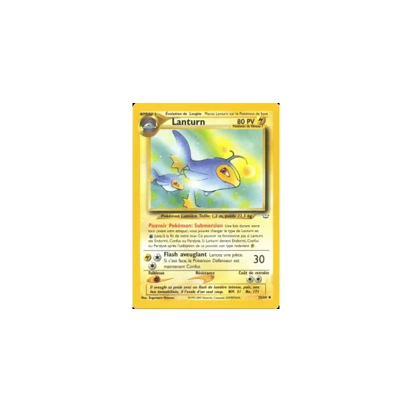 Découvrez Lanturn (nr032), une carte Pokémon de l’extension Neo Revelation, provenant du bloc Wizards. Idéale pour compléter votre collection, cette carte Peu Commune plaira autant aux collectionneurs qu’aux joueurs.