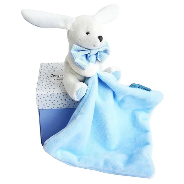 Ce petit lapin blanc avec son doudou bleu et son petit noud papillon est vraiment trop chou ! Tout doux, tout tendre, il est présenté dans une jolie boîte cadeau à petits pois bleus. Sympathique cadeau de naissance, ce mini doudou est lavable à 30°. Taille 10cm. Inédit ! Ce produit bénéficie de LA GARANTIE DOUDOU. Grâce à son numéro unique, Doudou perdu est vite retrouvé! Enregistrez votre Doudou et découvrez toutes les garanties sur le site doudouetcompagnie.com