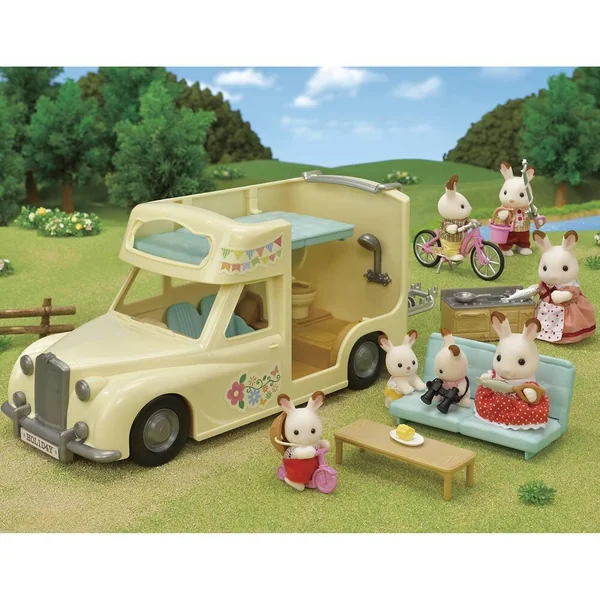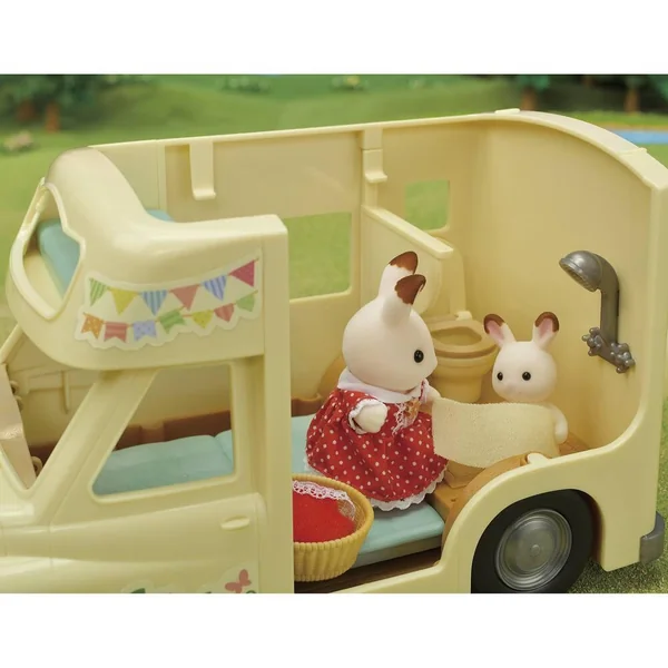 Le camping car possède de nombreux équipements et fonctionnalités pour faire vivre au Sylvanian Families une superbe aventure de camping ! Il est ouvert sur le côté pour permettre de jouer avec ses Sylvanian. L’intérieur du véhicule comprend un meuble de cuisine avec évier, des toilettes, une douche et des sièges transformables en couchettes. D’autres accessoires sont inclus comme du matériel de pêche, des ustensiles de cuisine, des jumelles, un vélo et une trottinette qui peuvent être accrochés à l’arrière du véhicule dans le porte-vélo. Figurine non incluse.