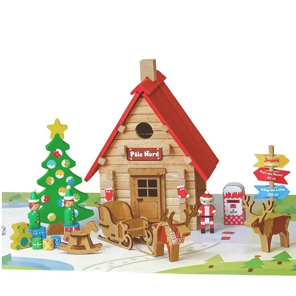 Découvrez toute la magie de Noël … Au beau milieu du Pôle Nord, l’enfant avec l’aide des 2 petits lutins prendra plaisir à construire le Chalet du Père Noël avec sa porte tout en bois, il installera la fameuse boîte aux lettres, puis préparera le traîneau et les rennes. Il assemblera et décorera le grand sapin de Noël et déposera à son pied le cheval à bascule, le nounours et les nombreux cadeaux…