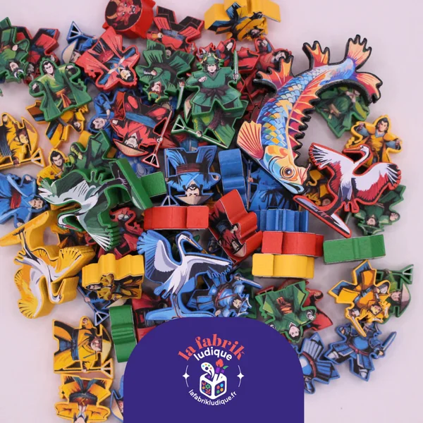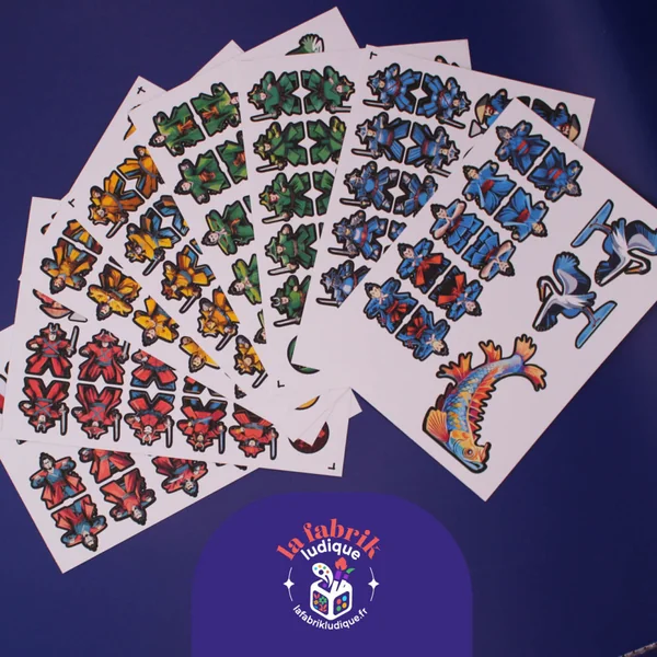 - Stickers recto/verso pour les pions guerriers, courtisans et jardiniers, les marqueurs d’influence, éventail et manche, ainsi que le Héron.