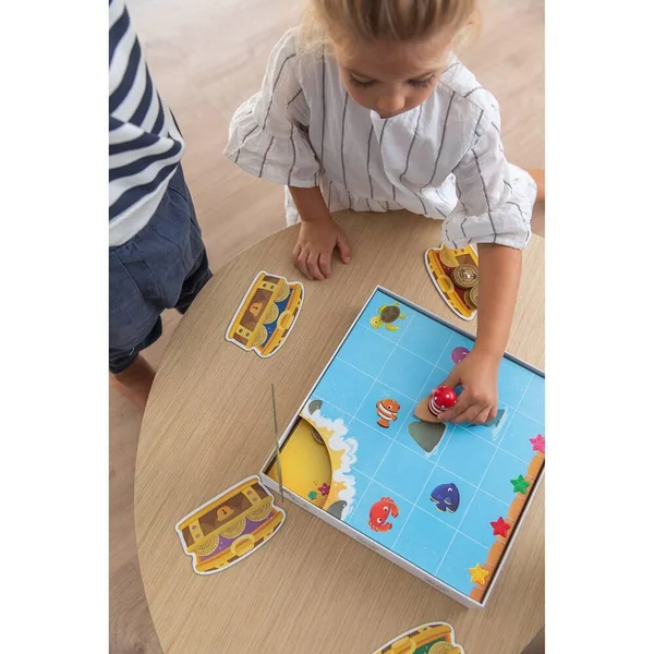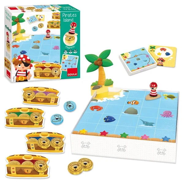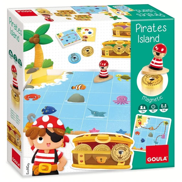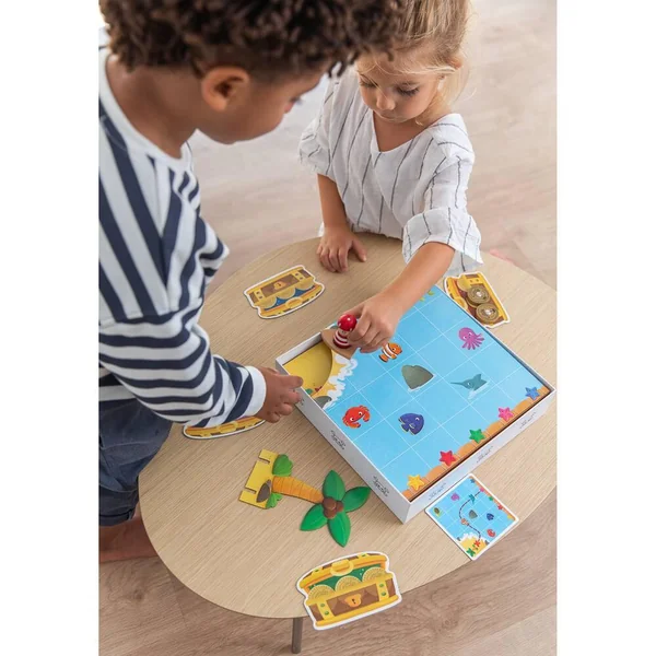Un jeu compétitif avec deux modes de jeu. Pour remporter le trésor le pirate doit suivre le chemin indiqué sur les cartes et être le premier à obtenir 3 pièces. Dans le deuxième mode de jeu, le pirate doit passer par dessus les éléments indiqué sur la carte et doit être le premier à obtenir 3 pièces.