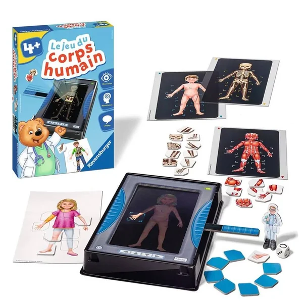 Les films transparents montrent la peau, les muscles et les os d’un enfant. Au cours du jeu, l’enfant cherche les différentes parties du corps en les sélectionnant dans l’appareil radiologique. Ce jeu favorise le développement du vocabulaire et du langage et la mémorisation des mots.