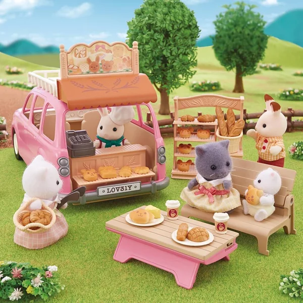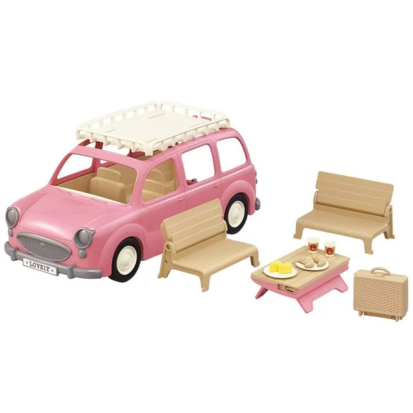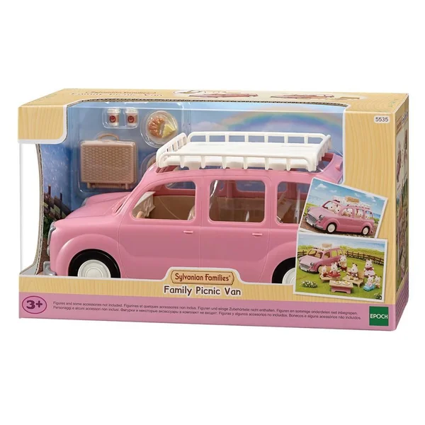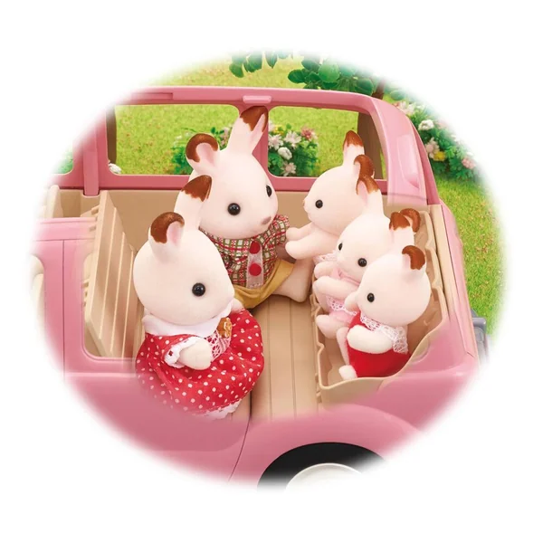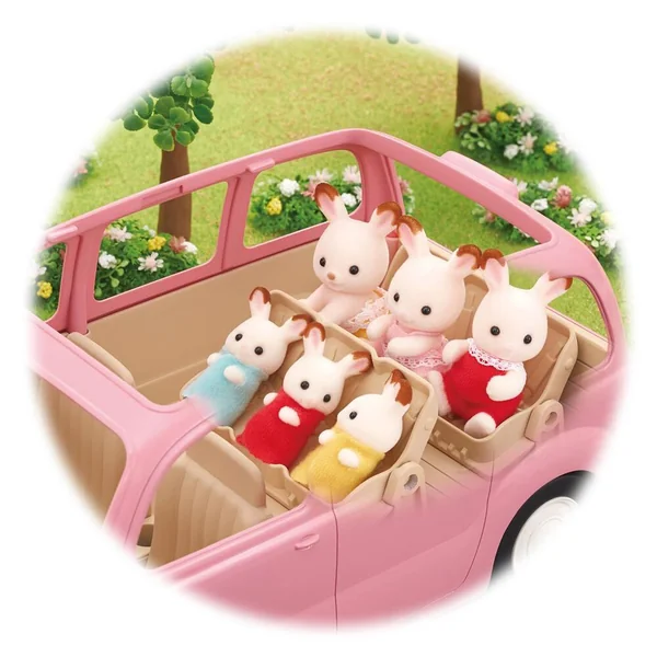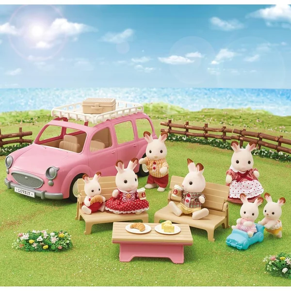 C’est une belle journée au village, les membres de La famille lapin chocolat rêvent de partir en balade ! Ils grimpent tous dans le monospace et s’en vont pique-niquer dans la forêt. Emmène tes Sylvanian se balader et pique-niquer au milieu de la nature dans le monospace qui peut contenir jusqu’à 7 personnages. Le volant et les roues tournent. Le dos des banquettes se retourne et se transforme en sièges-auto pour assoir les bébés. Sous la galerie de toit, se cache une marelle qui amusera les enfants ! Les banquettes sont amovibles et s’utilisent comme bancs de pique-nique. La porte du coffre se détache et se transforme en table. Une valisette contient le nécessaire à pique-nique composé d’un set d’assiettes et gobelets, de croissants et de fromage. Les gobelets tiennent dans la main des personnages et peuvent se ranger dans les porte-gobelets situés à l’avant du véhicule. Le monospace peut tirer la caravane. Contient 2 banquettes, 1 galerie de toit, 1 panier, 2 bancs, 1 table de pique-nique, 2 assiettes, 2 croissants et 2 morceaux de fromage.