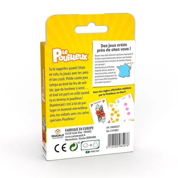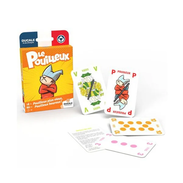 On vous fait revivre ces meilleurs souvenirs avec ce jeu revisité : des cartes aux dessins ludiques spécialement conçues pour jouer facilement au Pouilleux et des règles imprimées sur des cartes pour les avoir toujours à disposition.