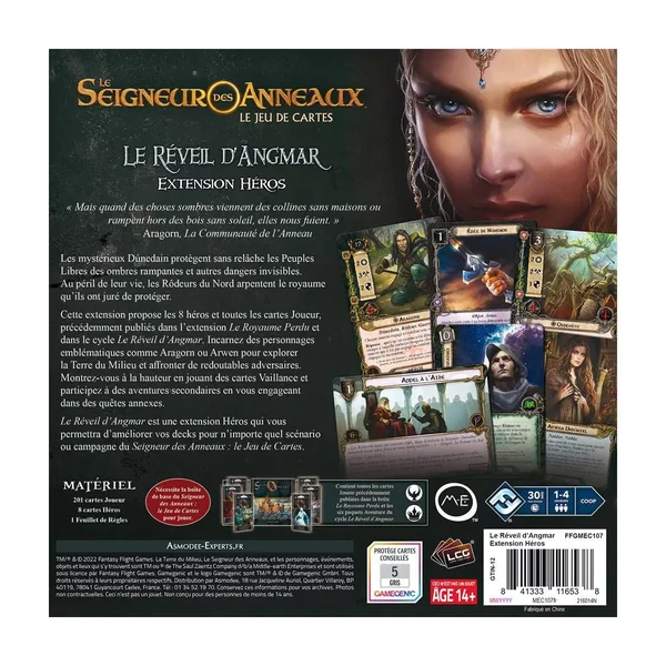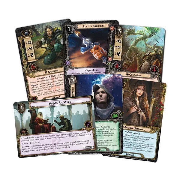 Cette extension propose les 8 héros et toutes les cartes Joueur, précédemment publiés dans l’extension Le Royaume Perdu et dans le cycle Le Réveil d’Angmar, Incarnez des personnages emblématiques comme Aragorn ou Arwen pour explorer la Terre du Milieu et affronter de redoutables adversaires. Montrez-vous à la hauteur en jouant des cartes Vaillance et participez à des aventures secondaires en vous engageant dans des quêtes annexes.