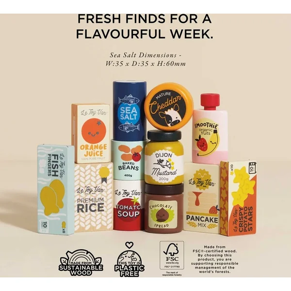 Ce set de 12 pièces est idéal pour les petits acheteurs afin de remplir leurs réfrigérateurs, congélateurs ou garde-manger. Le set comprend par exemple de la soupe de tomates, du sel marin, une tranche de fromage cheddar, de la moutarde de Dijon, une pâte à tartiner au chocolat, des étoiles de pommes de terre croustillantes, du riz, des bâtonnets de poisson, une boîte de jus d’orange et un smoothie. La nourriture en bois est un excellent moyen pour les enfants de se familiariser avec l’importance d’une alimentation saine et équilibrée.