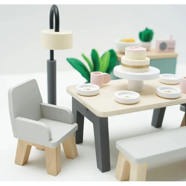 Équipement de salle à manger de la gamme de meubles Daisylane. Créez vos propres histoires avec cet ensemble. Inspire le jeu social, développe les compétences en communication. Fabriqué de manière éthique à partir de bois durable. Peint avec des couleurs non toxiques de la collection Daisylane. Collection prestigieuse de maisons de poupées et d’accessoires de la société Le Toy Van.