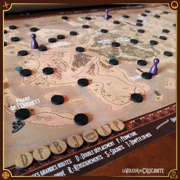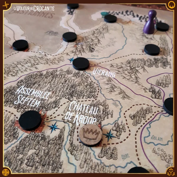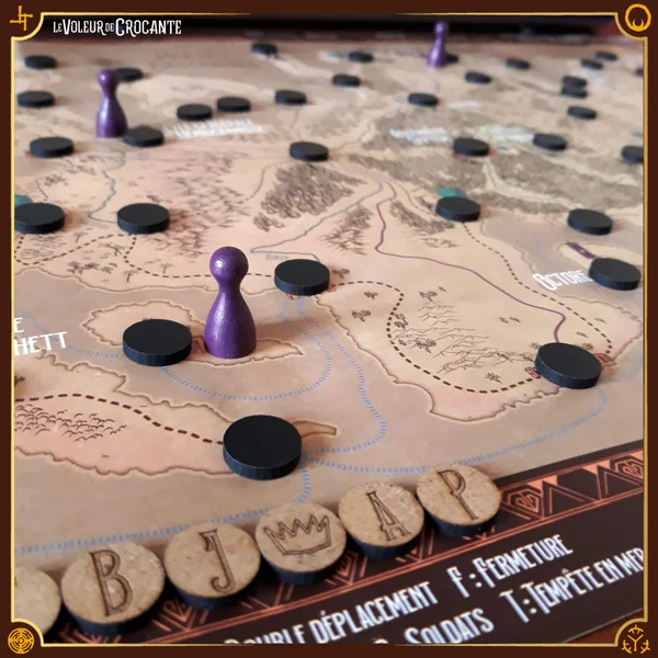 - 80 jetons : 36 jetons gravés, 34 jetons vierges, 4 jetons Couronnes, 3 jetons Bombes, 3 jetons Trésors.