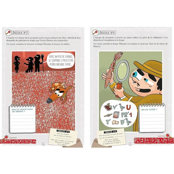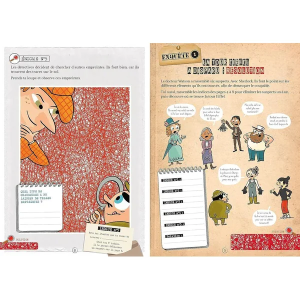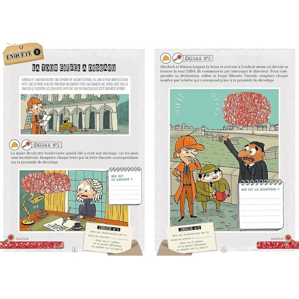 Un ouvrage qui invite le lecteur à devenir apprenti détective ! Il suit Sherlock Holmes et son cher Watson au cours de 10 enquêtes et les aide en résolvant énigmes et casse-tête. Le plaisir de retrouver tout l’univers de Sherlock Holmes mêlé à celui de Paris (au coeur de l’opéra Garnier et du palais de l’Elysée, dans les catacombes, à Montmartre, etc.). Des jeux variés : messages codés, rébus, devinettes, scènes à observer, grilles de mots, jeux de calculs, etc.