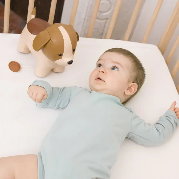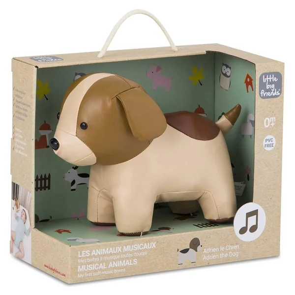 Adrien le Chien est une adorable peluche musicale toute douce,. Elle est agréable à manipuler grâce à sa texture souple et sa jolie forme arrondie. Véritable objet de décoration, elle trouvera bien vite sa place dans la chambre de bébé. Adrien le Chien adore jouer à cache-cache avec son copain Simon le Mouton. Agile, il se faufile dans tous les recoins de la ferme et Simon a bien du mal à le trouver ! Adrien joue Where Has My Little Dog Gone pour bébé.