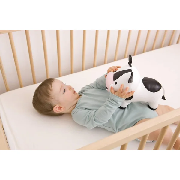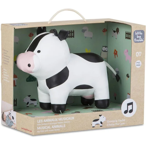 Emma la Vache est une adorable peluche musicale toute douce. Elle est agréable à manipuler grâce à sa texture souple et sa jolie forme arrondie. Véritable objet de décoration, elle trouvera bien vite sa place dans la chambre de bébé. Emma la Vache partage un grand pré fleuri avec Charles le Cheval, son compagnon de toujours. Quand elle a fini de mâcher la verte herbe des prés, Emma aime jouer La Flute Enchantée de Mozart pour apaiser bébé.