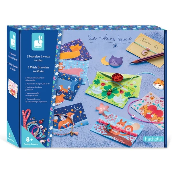 Faites un vœu ! Avec ce kit de création de bracelets, les enfants dès 8 ans fabriquent leurs propres bijoux à conserver ou à offrir tels des bracelets de l’amitié. Le principe ? Faire un vœu en fermant le bracelet avec des liens à nœud, puis lorsqu’ils se défont, le vœu est exaucé ! Les petits créatifs peuvent ainsi offrir leurs 5 bracelets à leurs proches pour leur souhaiter chance, amitié, voire magie … Présentés sur leur carte assortie et dans une belle enveloppe, les bracelets à vœux sont de sympathiques petits cadeaux. Grâce à cette activité créative, les enfants développent leur dextérité et leur minutie !