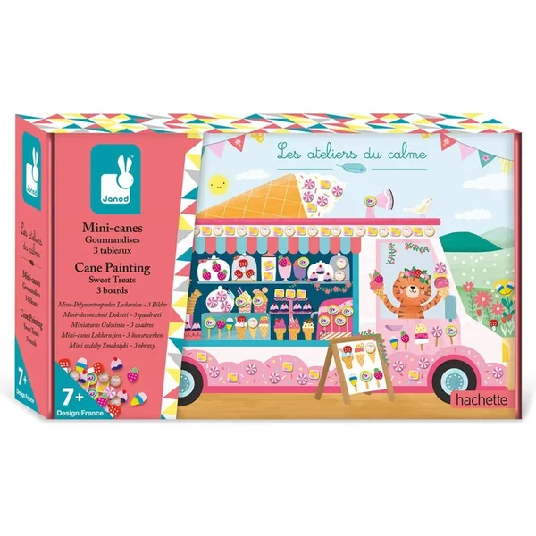Avis à tous les gourmands ! Grâce à ce coffret créatif, les enfants à partir de 7 ans décorent 3 tableaux avec des mini-canes. Ces petites tranches en pâte polymère en forme de fruits ou de gâteaux viennent se coller sur les tableaux pour leur apporter toujours plus de gourmandise ! Pour cela, les enfants s’aident de la pince fournie et placent les sucreries sur les tableaux autocollants : une activité qui invite au calme, à la précision et à l’expression créative.