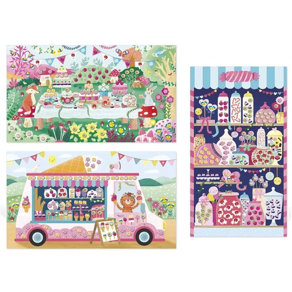 Les instructions et les modèles à reproduire sont imprimés à l’intérieur de la boîte, ainsi les petits créatifs pourront décorer leurs tableaux en toute autonomie. Au menu de ces décors gourmands, la vitrine alléchante d’une confiserie, un camion de glaces (mais pas seulement), et un banquet au cœur de la forêt à l’heure du thé : les enfants ajoutent les bonbons et les biscuits à la scène et la magie des gourmandises opère ! Pour décorer chaque tableau proposé dans ce kit de loisir créatif, il faudra compter 15 minutes par illustration. Voilà un kit créatif sucré à souhait !