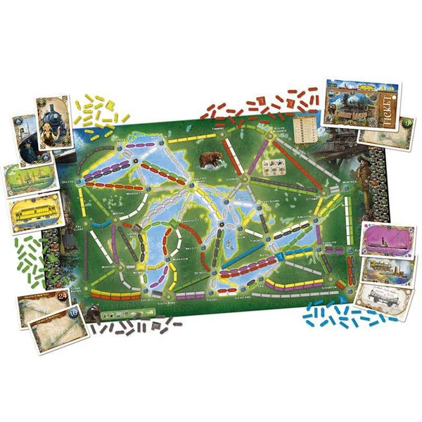 Les joueurs rassemblent des cartes de différents types (trains et bateaux) pour s’emparer des voies ferrées et maritimes sur un plateau double-face, richement illustré représentant la carte du monde dun côté et celle des Grands Lacs d’Amérique du Nord de l’autre.