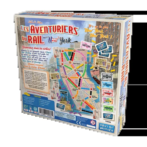 Les Aventuriers du Rail : New York est une variante plus courte des Aventuriers du Rail. Les joueurs doivent se frayer un chemin, cette fois-ci en taxi, à travers New York, afin de visiter les attractions touristiques et compléter leur cartes Destination. Avec son rythme soutenu et son format réduit, les Aventuriers du Rail : New York promet de plaire aussi bien aux débutants, qui pourront apprendre à jouer en 3 minutes, qu’aux joueurs expérimentés.
