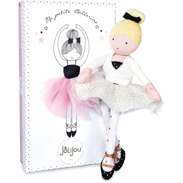 Une vraie PETITE BALLERINE: joli tutu blanc parsemé de fins plumetis dorés, cache coeur blanc, chaussons de danse, noeud et justaucorps noirs, tous les codes vestimentaire de la danseuse sont représentés. Cette grâcieuse demoiselle est présentée dans une magnifique boîte cadeau originale avec le graphisme d’une ballerine … qui porte un vrai tutu en tissu de tulle rose. A offrir dès la naissance. Lavage à 30°, séchage mécanique à basse température. Inédit ! Ce produit bénéficie de LA GARANTIE DOUDOU. Enregistrez votre poupée et découvrez toutes les garanties sur le site jolijou.fr