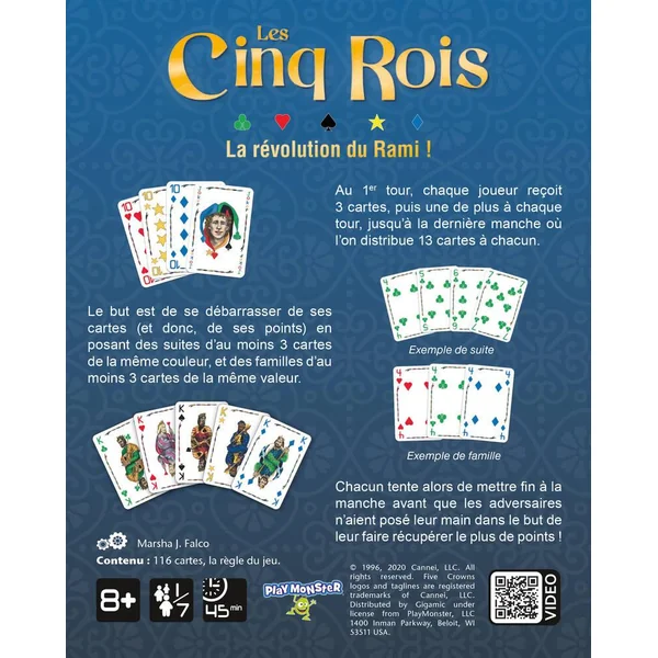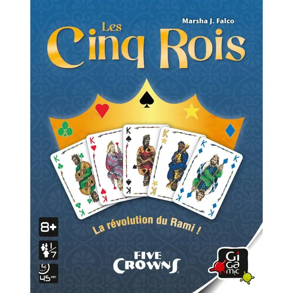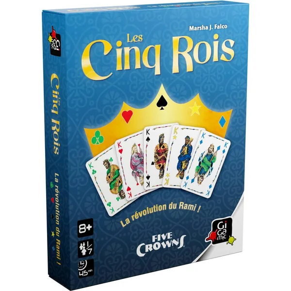 La révolution du Rami. Les 5 rois est un jeu de cartes inspiré du Rami avec 5 couleurs et une bonne dose de malice en plus ! Les 5 couleurs : pique, coeur, carreau, trèfle, étoile permettent de faciliter l’arrangement de votre main en suite ou en famille. Au fur et à mesure des manches les joueurs joueront avec une carte de plus et le joker changera en fonction : si le tour est joué avec 5 cartes, le joker pour cette manche sera le 5 … Faites les bonnes combinaisons pour vous débarrasser en premier de vos cartes et marquer manche après manche le moins de points possible. Un jeu universel et simple pour lequel on enchaîne les parties avec plaisir ! Nombre de joueurs : de 1 à 7. Durée d’une partie : 30 minutes.