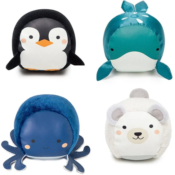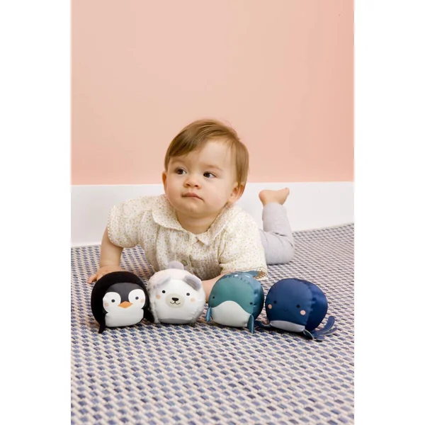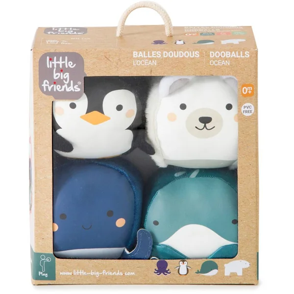 Set de 4 balles doudous. Leur forme ronde et leur texture souple permettent aux petites mains de les attraper facilement. Leurs textures contrastées, leurs oreilles toutes douces en tissu craquant et leur grelot interne amusent les jeunes enfants et éveillent leur curiosité? Parfait pour apprendre à attraper, à lancer et à viser ! 8cm de diamètre.