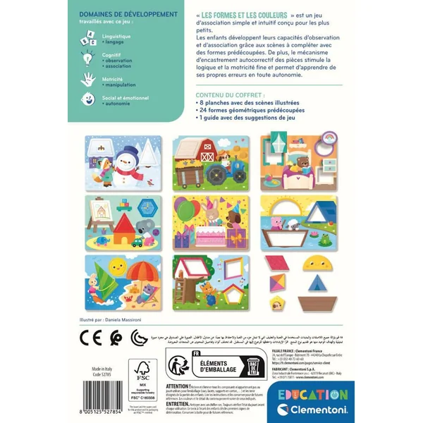 Contient 4 planches et 16 pièces colorées permettant 3 modes de jeux différents pour apprendre les formes et les couleurs.