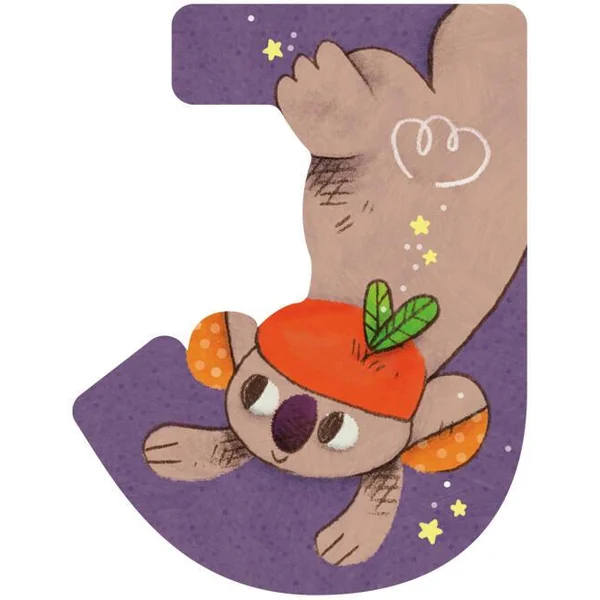 Lettre J en bois, illustrée avec un koala pour décorer la chambre de bébé ou composer un joli abécédaire. Lettre facile à prendre en main pour se familiariser avec l’alphabet.