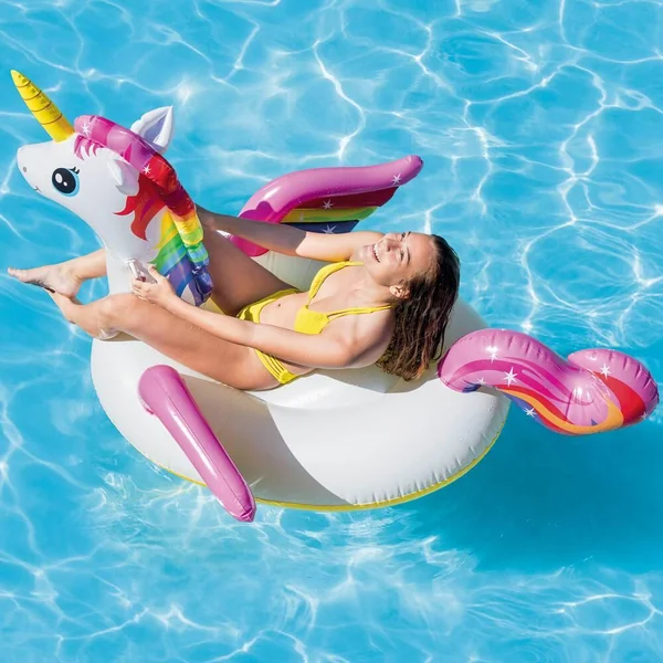Licorne colorée gonflable. Avec 2 poignées de maintien. 2 chambres à air. En vinyle (0.30 mm). 1 rustine de réparation incluse. Pour une personne uniquement. Poids maximum de l’utilisateur : 40 kg. A utiliser sous la surveillance d’un adulte.