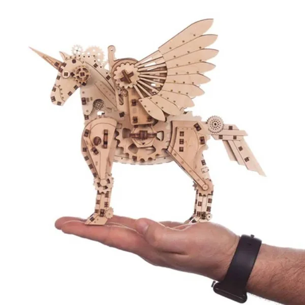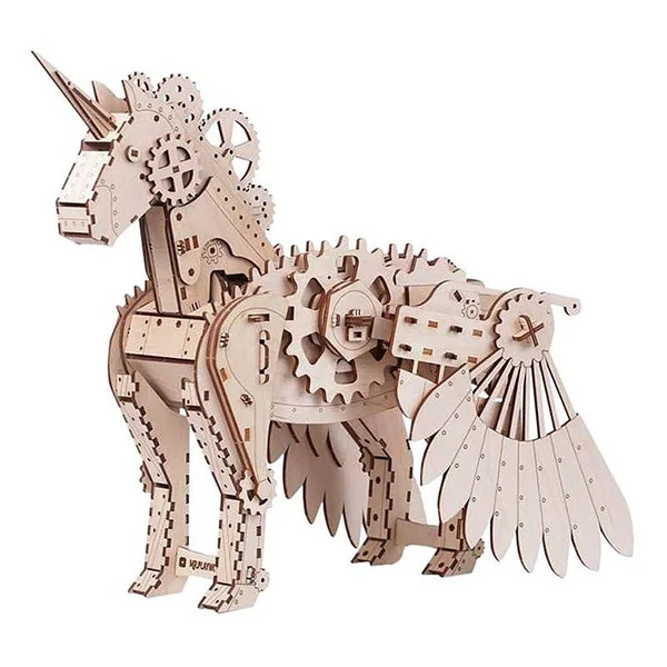 Assemblez puis faites déployer ses ailes à cette magnifique licorne tout en bois grâce à un système d’engrenages ingénieux.