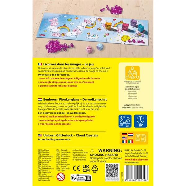 Les quatre licornes Bonheur étincelant, Poussière d’étoile, Fleur magique et Tourbillon magique habitent au lointain pays des nuages et sont très amies. Toutes joyeuses, elles gambadent sur les doux nuages cotonneux, glissent sur les arcs-en-ciel multicolores comme sur des toboggans et s’amusent avec les cristaux de nuage scintillants. Mais voilà qu’un orage se prépare à l’horizon ! Vite, les licornes se sauvent en direction du soleil. En chemin, elles veulent récupérer le plus possible de cristaux de nuage avant que l’orage ne se déclenche. Le but du jeu est d’aller sur le nuage soleil en récupérant le plus grand nombre de cristaux roses. Pour cela, lancez le dé et appliquez le résultat : avancer d’un certain nombre de cases ou rester sur la même case. En fonction de la case atteinte, prenez un raccourci en passant par un arc-en-ciel, récupérez des cristaux de nuages, ou offrez un cristal !