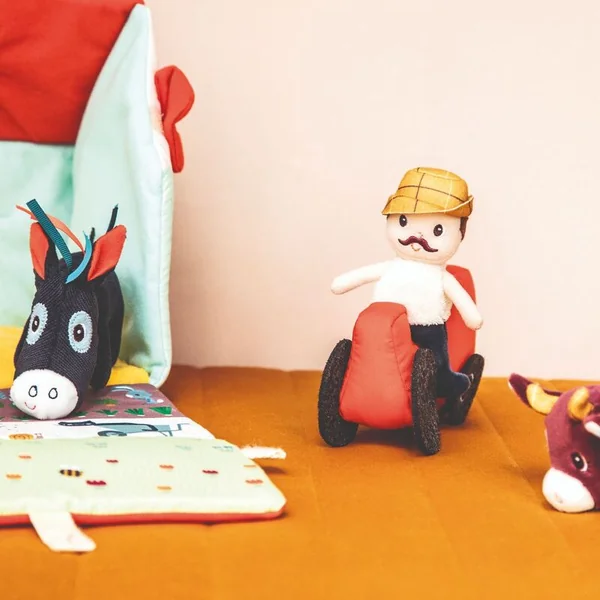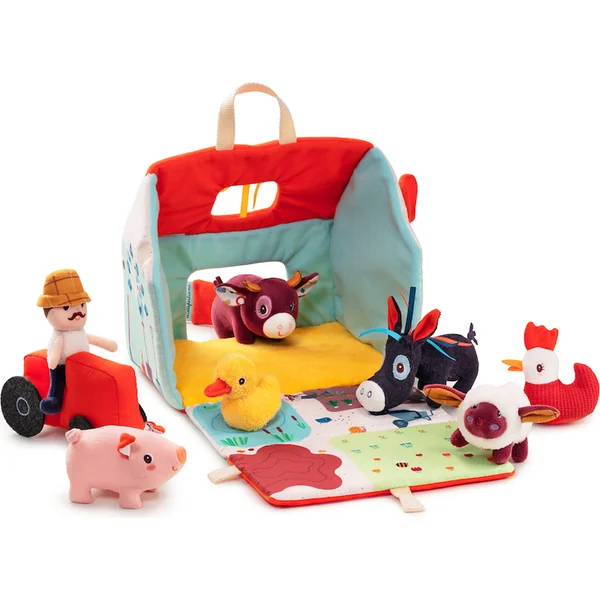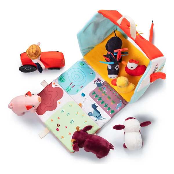Une belle ferme textile avec des animaux, un fermier et un tracteur. Tout est cousu avec des matériaux de qualité. La ferme est joliment colorée et les enfants peuvent explorer différentes textures. Le toit et les portes se fixent avec du velcro.