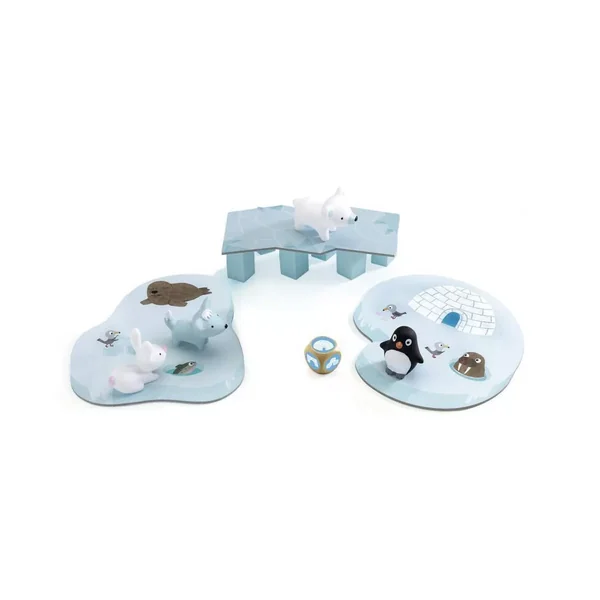 Il y a cinq mignons animaux polaires en plastique d’un côté du pont, tenant sur 6 glaçons et un igloo de l’autre côté. À tour de rôle, les joueurs emmènent leurs animaux dans l’igloo avant que le pont ne tombe. Le dé a 3 faces : aller au pont, aller à l’igloo, enlever un glaçon.
