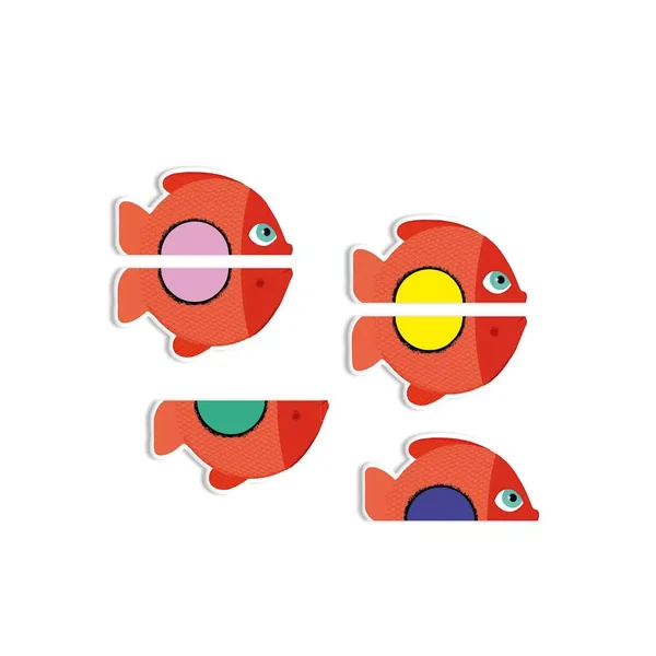 Pour réussir une bonne pêche, il faut des poissons entiers ! Qui sera le premier à en pêcher 4 ? Au début du jeu, les 24 demi-poissons sont placés en vrac au centre de la table, face visible. Tous les joueurs jouent en même temps et tentent de reconstituer au plus vite 4 poissons pour gagner la partie. Attention, pour que le poisson soit valide, il faut retrouver les 2 bons côtés avec la même tache de couleur !