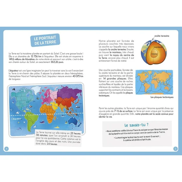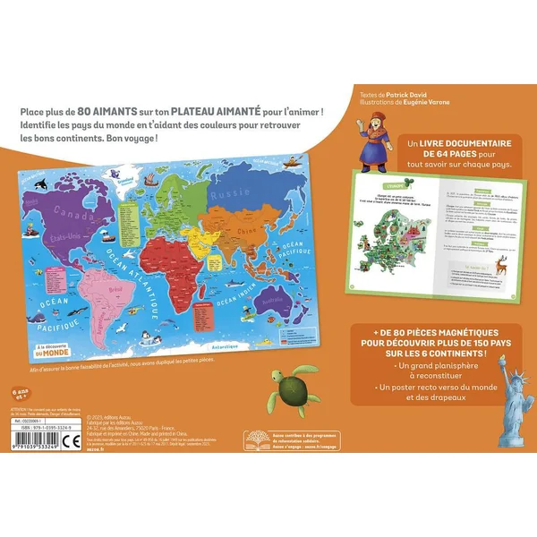 La boîte comprend un livre documentaire de 64 pages pour tout savoir sur les continents et les pays du monde, ainsi que + de 80 aimants à replacer sur un grand plateau aimanté.