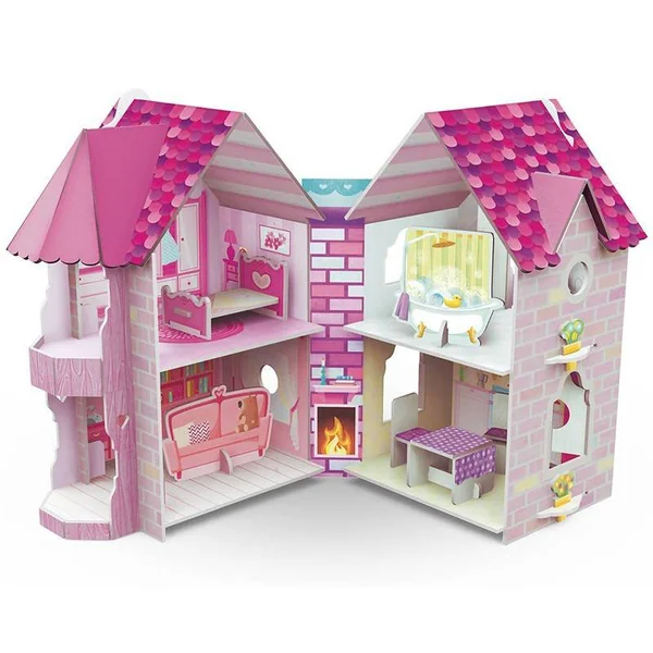 Huit cartons prédécoupés contiennent tous les éléments nécessaires à la construction d’une fantastique maisonnette avec ses nombreuses chambres aux détails minutieux, ainsi que tous les objets de la jolie petite poupée.